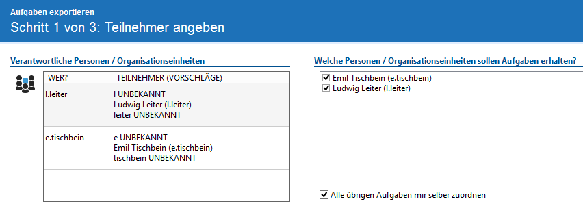 - Wählen Sie im 1. Schritt die Teilnehmer aus. Anhand der "Wer?"-Angaben werden die verantwortlichen Teilnehmer aufgelistet. Im Bereich "Welche Personen / Organisationseinheiten sollen Aufgaben erhalten?" können Sie über die Kontrollkästchen wählen, welchen Personen Aufgaben zugewiesen werden sollen.