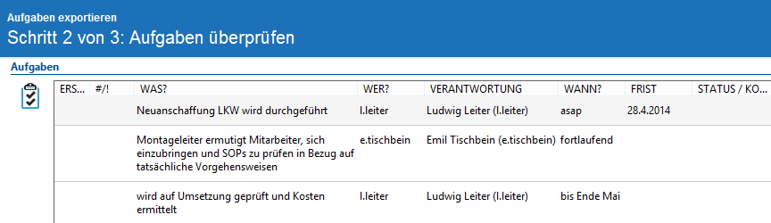 - Im 2. Schritt finden Sie eine Auflistung der Aufgaben, die erstellt werden sollen. Überprüfen Sie die Aufgaben, Verantwortungen und Fristen.