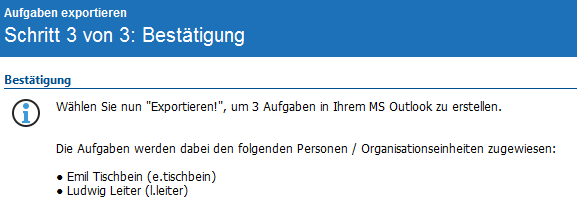 - Im 3. Schritt werden Ihnen eine Übersicht der Personen sowie die Anzahl der Aufgaben angezeigt. Bestätigen Sie die Angaben mit "Exportieren!".