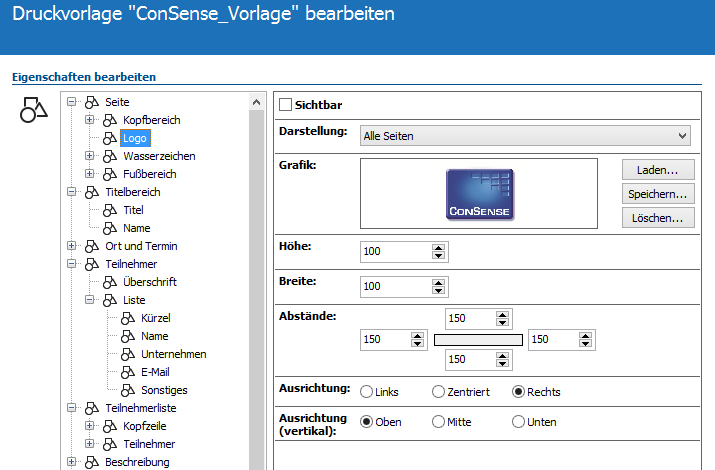 - Im Fenster "Druckvorlage "Name der Vorlage" bearbeiten" stehen Ihnen unterschiedliche Eigenschaften zur Verfügung, über die Sie Ihre Vorlage gestalten können. Erweitern Sie im linken Bereich über das Symbol + die gewünschten Eigenschaften, z. B. Seite | Logo.