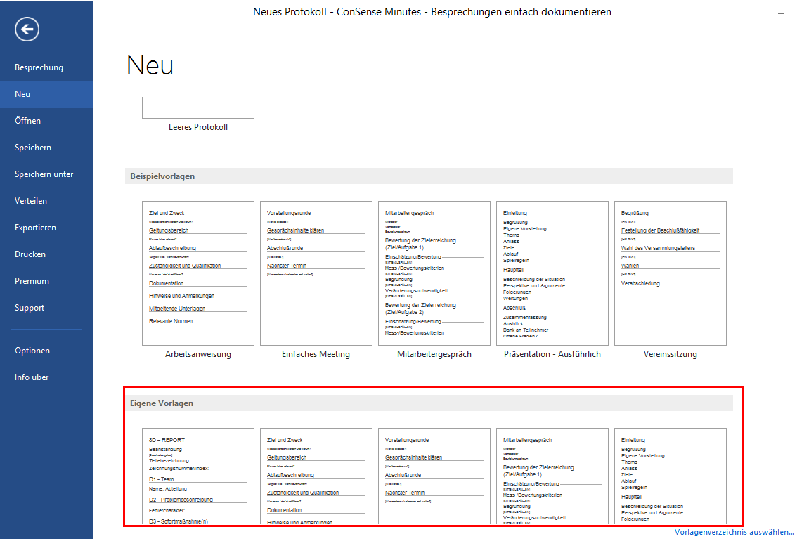 Nach der erfolgreichen Konfiguration steht unter "DATEI | Neu" ein neuer Bereich "Eigene Vorlagen" zur Verfügung. Alle in dem zuvor konfigurierten Verzeichnis abgelegten ConSense Minutes Vorlagen erscheinen dort automatisch.