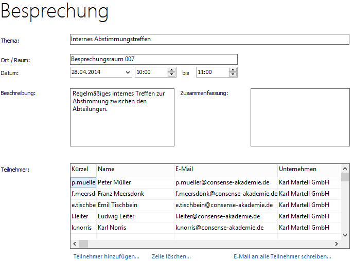 Im Arbeitsbereich "Besprechung" erfassen Sie die Informationen wie Thema, Ort, Teilnehmer usw. der Besprechung.