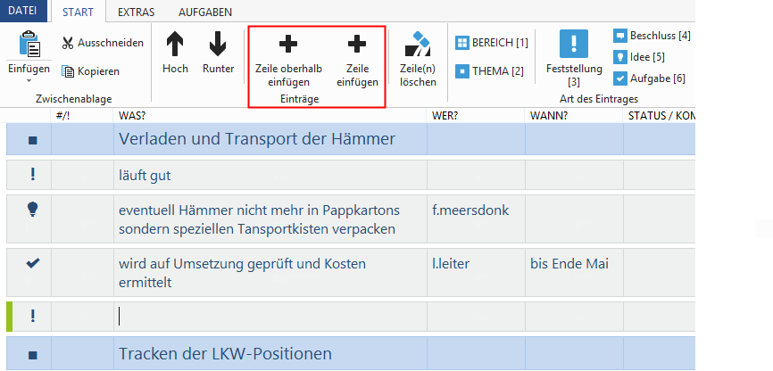 - Fügen Sie Ihrem Protokoll Zeilen hinzu. Klicken Sie dazu in der Registerkarte "Start" in dem Bereich "Einträge" auf "Zeile einfügen" oder "Zeile oberhalb einfügen".