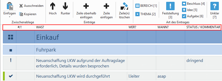 | Was? | Hauptspalte für die Texteingabe der Inhalte des Protokolls. |