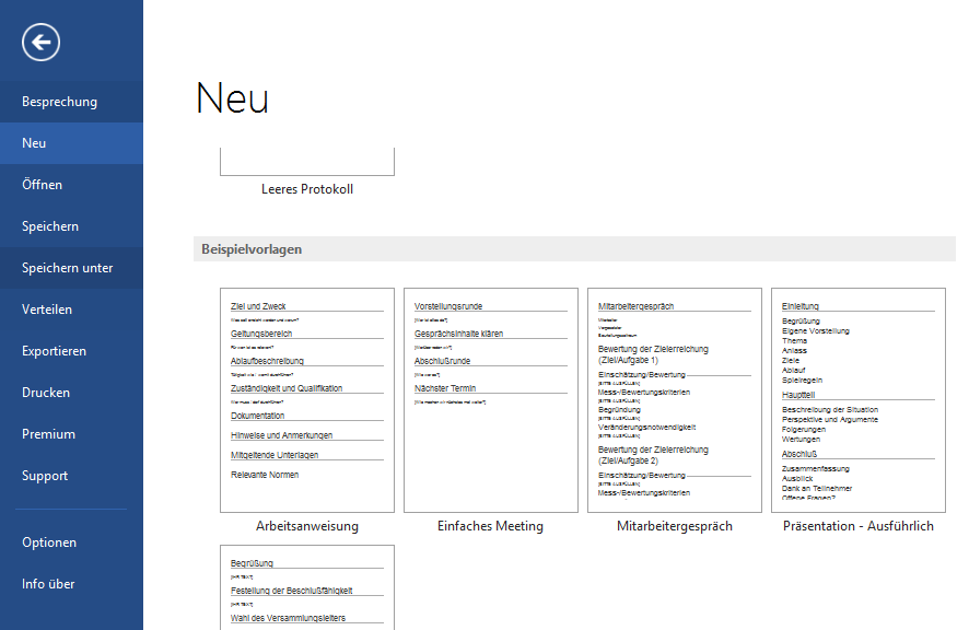 | Neu | Neues Protokoll öffnen. Sie können zwischen Standardvorlagen, Beispielvorlagen oder eigenen Vorlagen auswählen. |